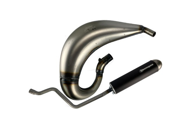 - An den Krümmer schließt sich der eigentliche Auspuff-Körper an. Bei einem klassischen 2-Takt Resonanzauspuff werden hier die Resonanzwellen so genutzt, dass die Leistung des Motors verbessert werden kann.