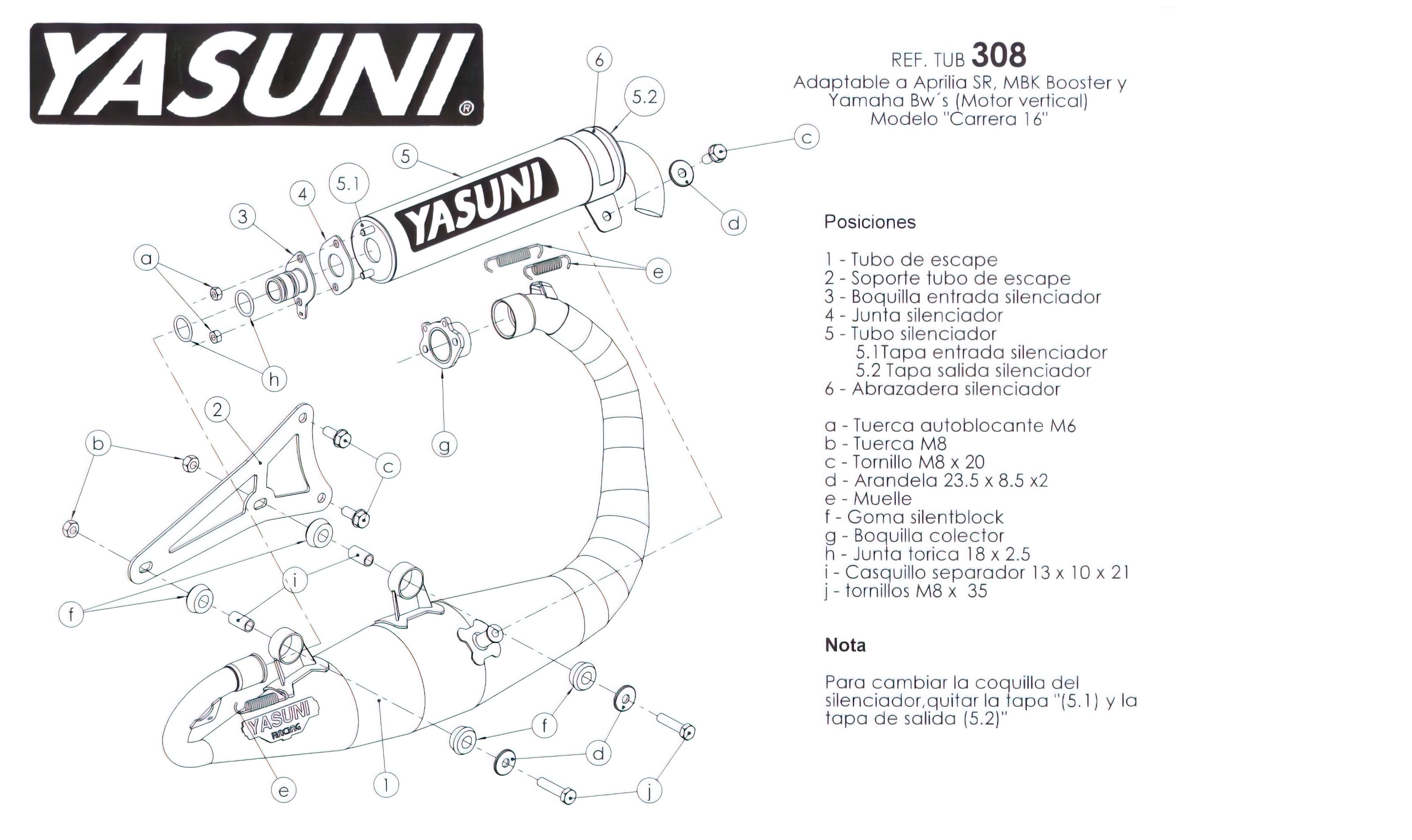 Die Auspuffanlage Yasuni Carrera 16, kurz C16, ist eine hochwertige Racing-Anlage vom spanischen Hersteller Yasuni. Klassischer Resonanzauspuff mit Alu Endschalldämpfer (in mehreren Farben erhältlich).