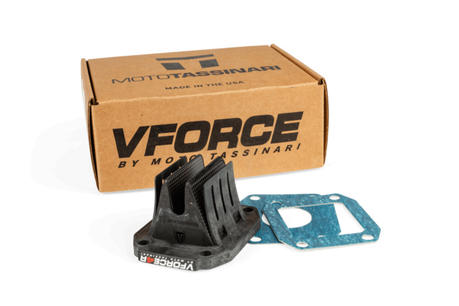 Die VForce 3 von Moto Tassinari verfügt über eine besondere Architektur, die in der Mitte wie ein V geformt ist. Dank dieses speziellen Designs können doppelt so viele Membranplättchen (4 statt 2) eingesetzt werden, was zu einer verbesserten Zylinderfüllung führt. Dies wiederum verbessert die Gasannahme und die Leistung bei niedrigen Drehzahlen.
