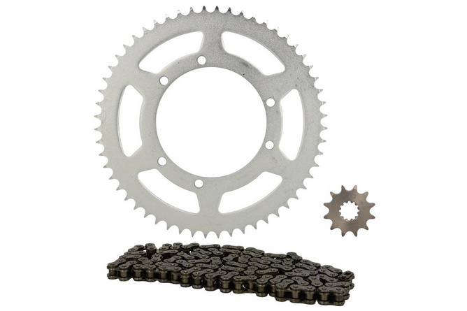 The chain set includes the main components of the chain drive, which are used to transmit the engine power to the rear wheel. Chain kits consist of the following parts: Front sprocket, rear sprocket and chain. You can buy these parts separately or as a complete chain set.