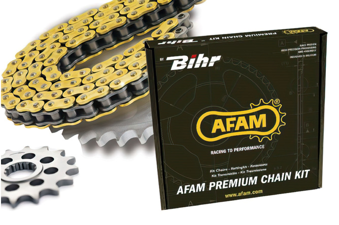 The chain set includes the main components of the chain drive, which are used to transmit the engine power to the rear wheel. Chain kits consist of the following parts: Front sprocket, rear sprocket and chain. You can buy these parts separately or as a complete chain set.