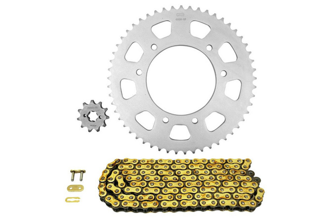 The chain set includes the main components of the chain drive, which are used to transmit the engine power to the rear wheel. Chain kits consist of the following parts: Front sprocket, rear sprocket and chain. You can buy these parts separately or as a complete chain set.