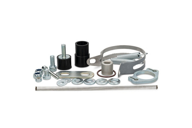 Replacement for the original mounting hardware for the exhaust Voca Cross Rookie 50 - 70cc Beta RR Enduro / SM from 2012. Complete kit including all parts - springs, washers, bushings, screws, silentblocs, spacers, etc.