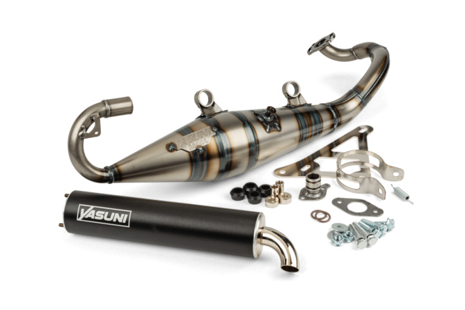The Yasuni R-Pro exhaust offers uncompromising performance, but is street legal. It is ideal for use on 70cc entry-level tuning cylinders, but can also be used with 50cc cylinders. While the Yasuni Z is designed purely for 50cc cylinders, the Yasuni R and the R-Pro are intended for 70cc tuning cylinders.