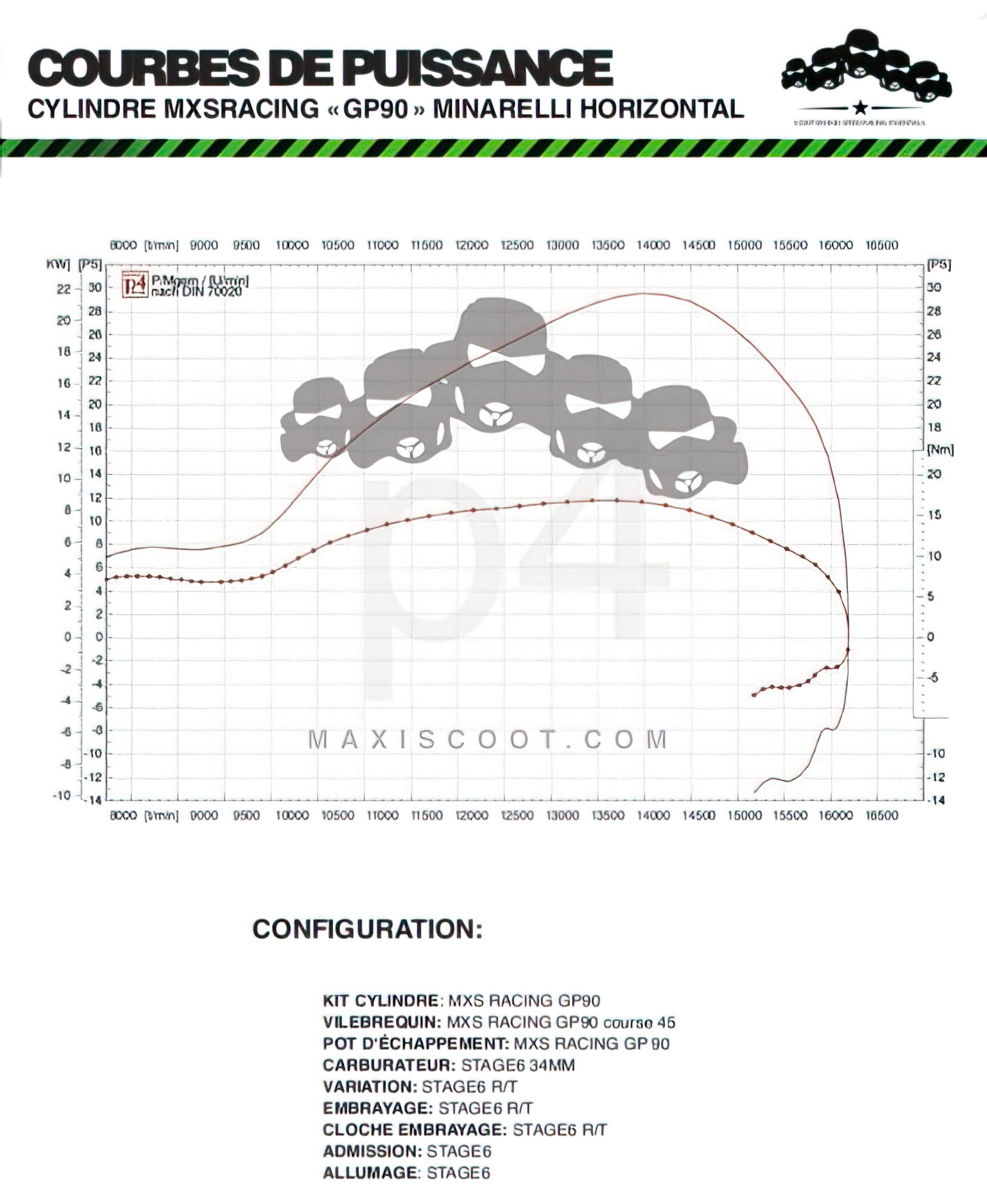 The kit has to be combined with the MXS crankshaft GP 45mm stroke (90mm conrod), the MXS exhaust GP90, a 30mm carburetor (38mm would be ideal), a racing clutch, an oversize variator, a "long" transmission and a digital inner rotor ignition (Stage6 R/T).