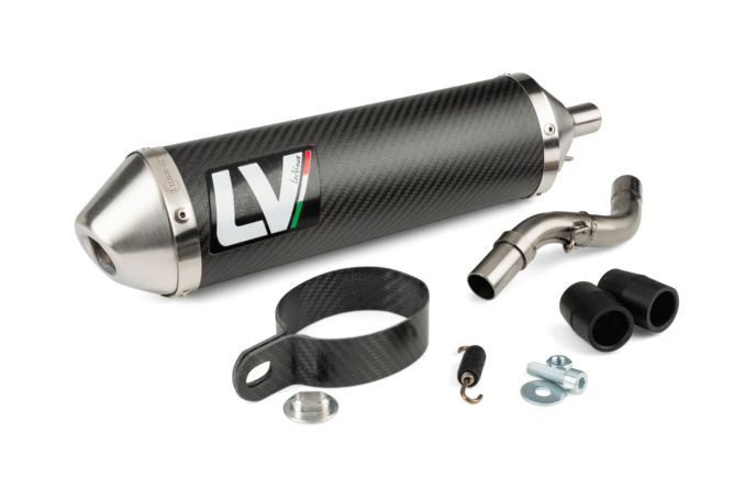 The full carbon housing consists of two layers of pre-impregnated carbon fiber. The silencer is very robust and at the same time very light, and above all it looks fantastic. The silencer clamp is also made of carbon. The sporty look is rounded off by the elegant LeoVince logo.