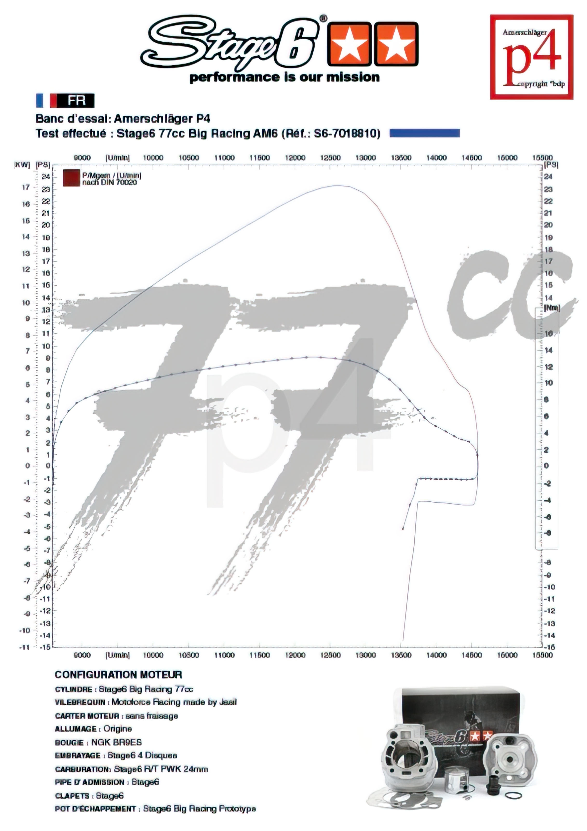 La cilindrada es de 77cc (pistón de 50mm), es decir, sin homologación de carretera. Debe utilizar un cigüeñal reforzado con carrera estándar.