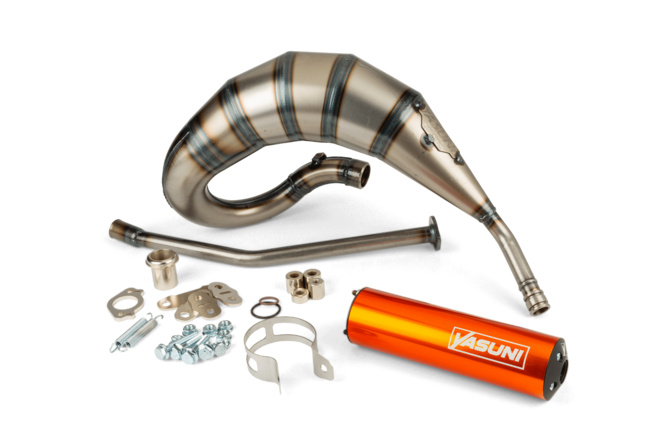Yasuni, el especialista español en escapes, asegura un sonido agresivo y una mejora real del rendimiento. Este modelo está pensado para sacar lo mejor en la zona media y alta del cuentavueltas, ideal para configuraciones afinadas con cilindros deportivos o de competición de 50cc o 70cc.
