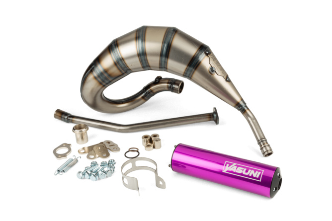 Yasuni, el especialista español en escapes, asegura un sonido agresivo y una mejora real del rendimiento. Este modelo está pensado para sacar lo mejor en la zona media y alta del cuentavueltas, ideal para configuraciones afinadas con cilindros deportivos o de competición de 50cc o 70cc.