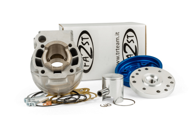 Le 2Fast 50 est un cylindre haut de gamme en aluminium avec un revêtement Nikasil hautement résistant, complet avec une culasse anodisée bleue typique de la marque. Le cylindre est livré avec un piston mono-segment, dont la tête est bombée complète parfaitement le dôme de la culasse haute compression.