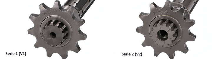 ATTENZIONE: Esistono due versioni diverse di trasmissioni per motori AM6. La Serie 1 o V1, identificata da un albero di uscita solido con filettatura da 6 mm (foro piccolo) e la Serie 2 (V2) con albero cavo e filettatura da 8 mm (foro grande). Si prega di confrontare l'immagine fornita con l'albero di uscita della vostra moto per evitare errori nell'ordine.