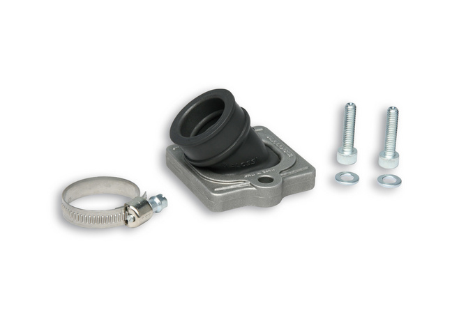 Collettore di aspirazione Malossi ruotabile a 360° per scooter Piaggio 2 tempi. Dritto e corto, può essere ruotato di 360° grazie al design in due parti con gomma di aspirazione e piastra di base, per un'installazione completamente flessibile. Il gommino di aspirazione viene fissato avvitando la piastra di base al carter del motore o al collettore di aspirazione del pacco lamellare.