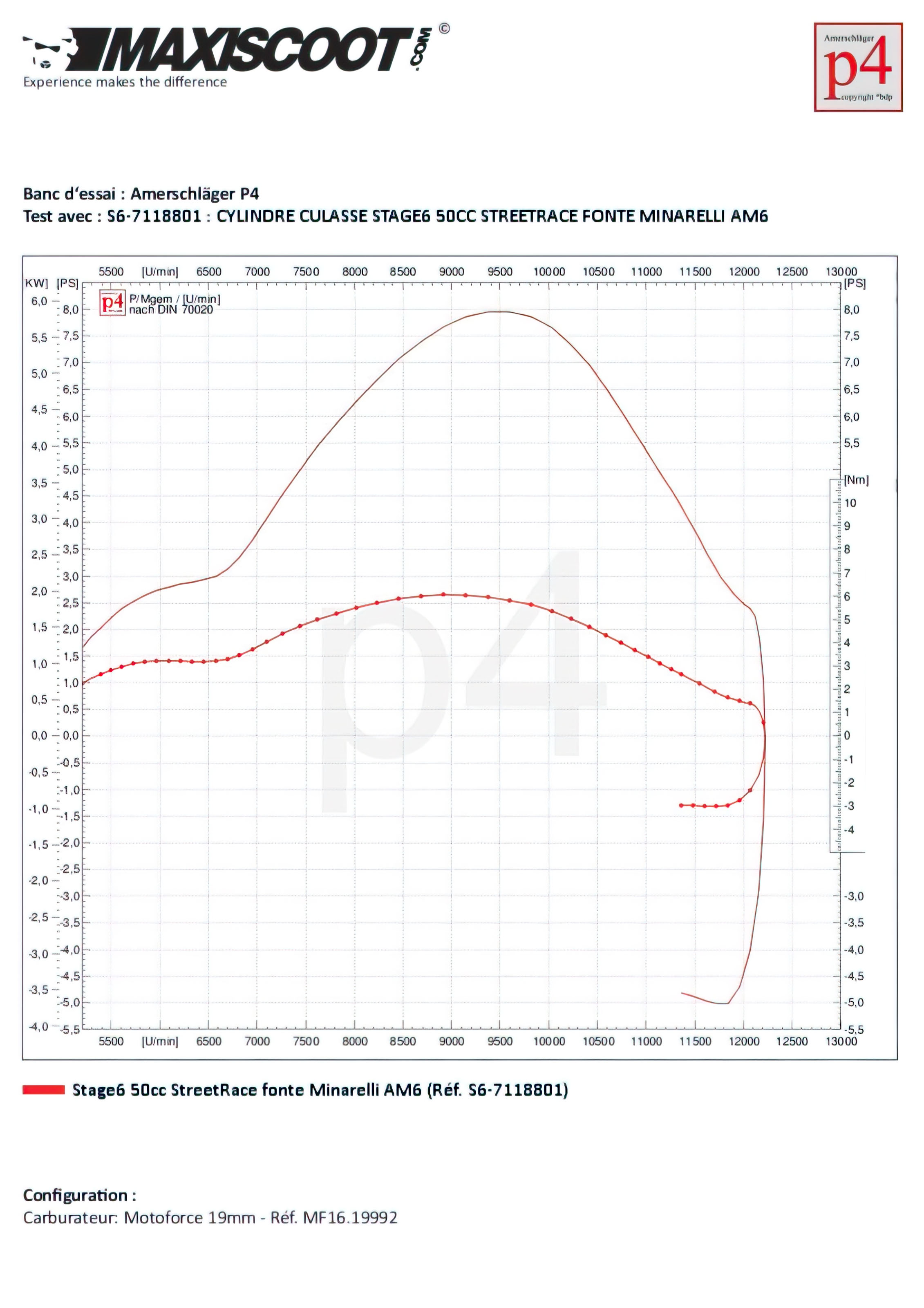 La potenza erogata è notevolmente superiore a quella del cilindro di serie: è possibile raggiungere gli 8 CV, ovvero 3-4 CV in più! Per ottenere queste prestazioni, si consiglia l'uso di un sistema di scarico sportivo come lo Stage6 Streetrace e di un carburatore più grande (17,5 - 21 mm). Con un'accelerazione migliorata e una maggiore potenza complessiva, lo Streetrace è la scelta perfetta per chi vuole più potenza, ma non vuole aumentare la cilindrata del motore.