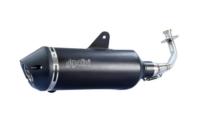 Polini propone un sistema di scarico sportivo per maxi scooter a 4 tempi. Il suo design assicura un suono piacevole e gutturale, senza raggiungere livelli di rumorosità eccessivi per rispettare le norme. In termini di potenza, Polini ha annunciato guadagni sia ai bassi che agli alti regimi.